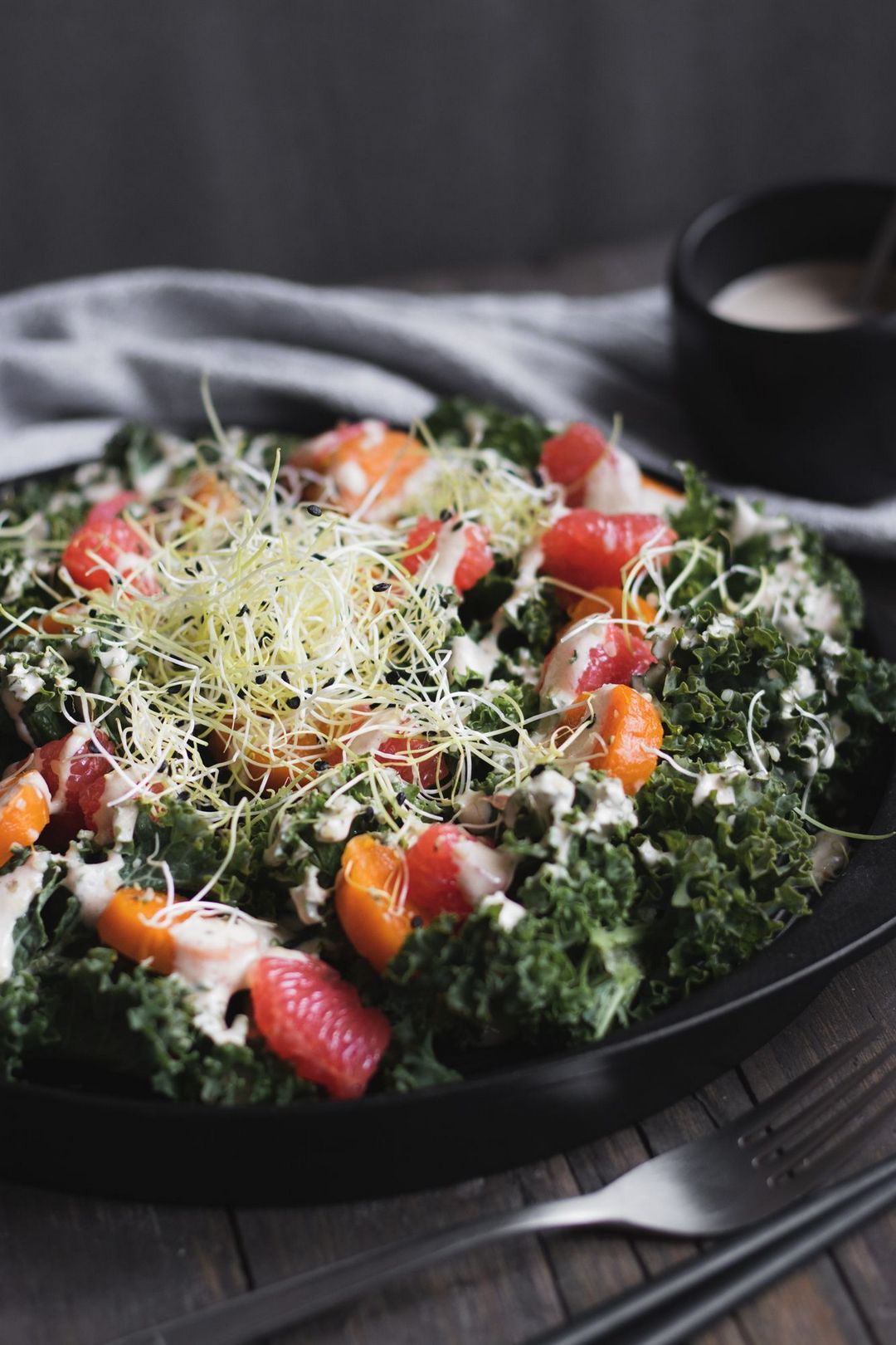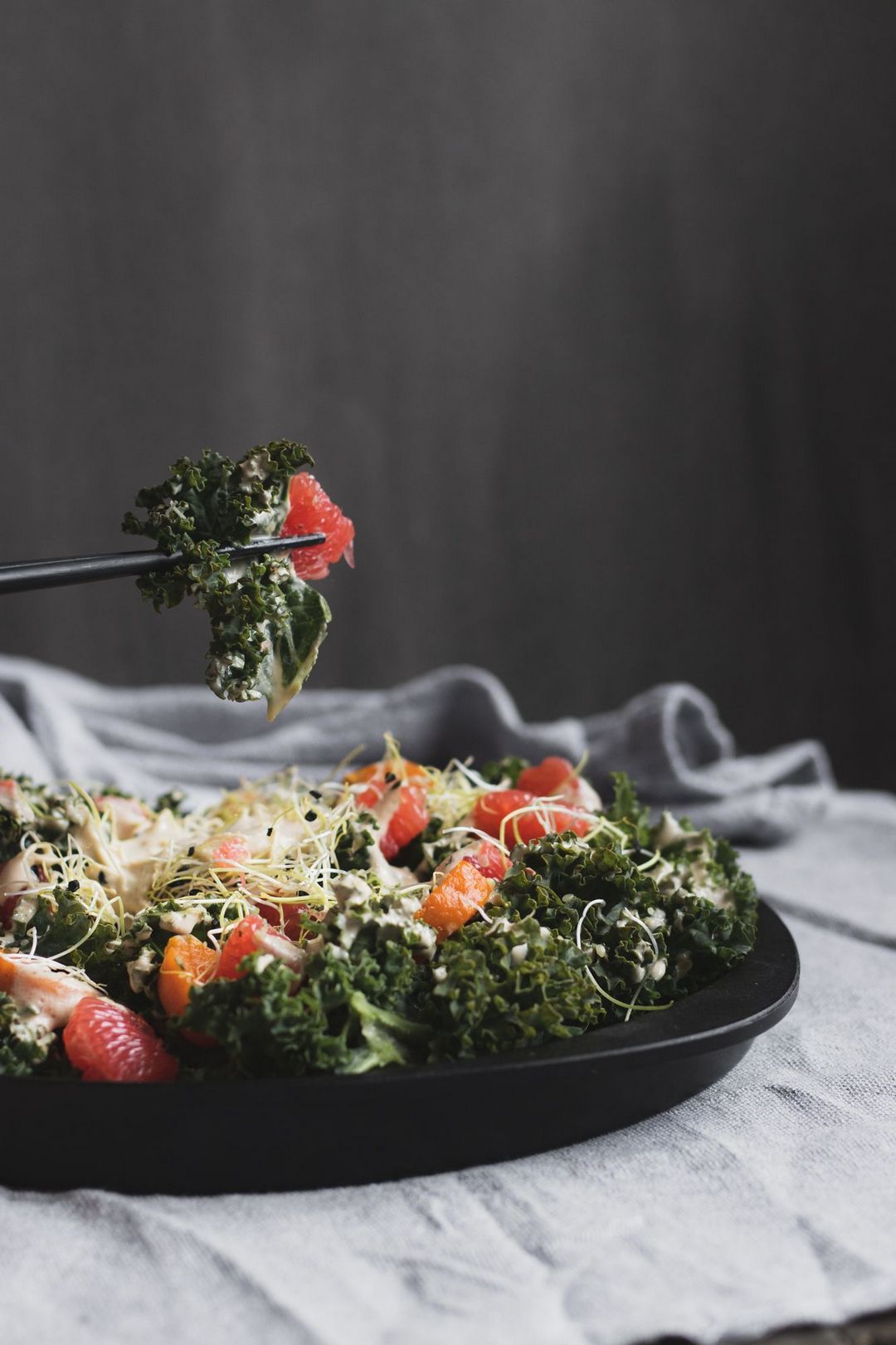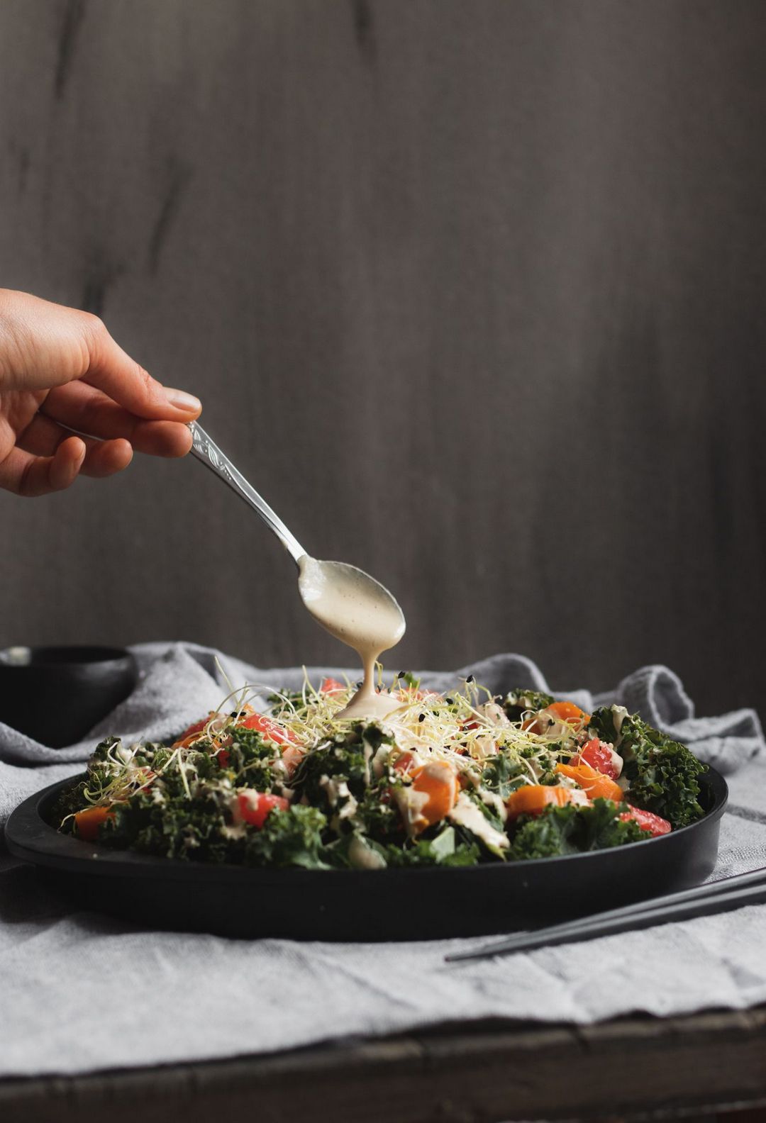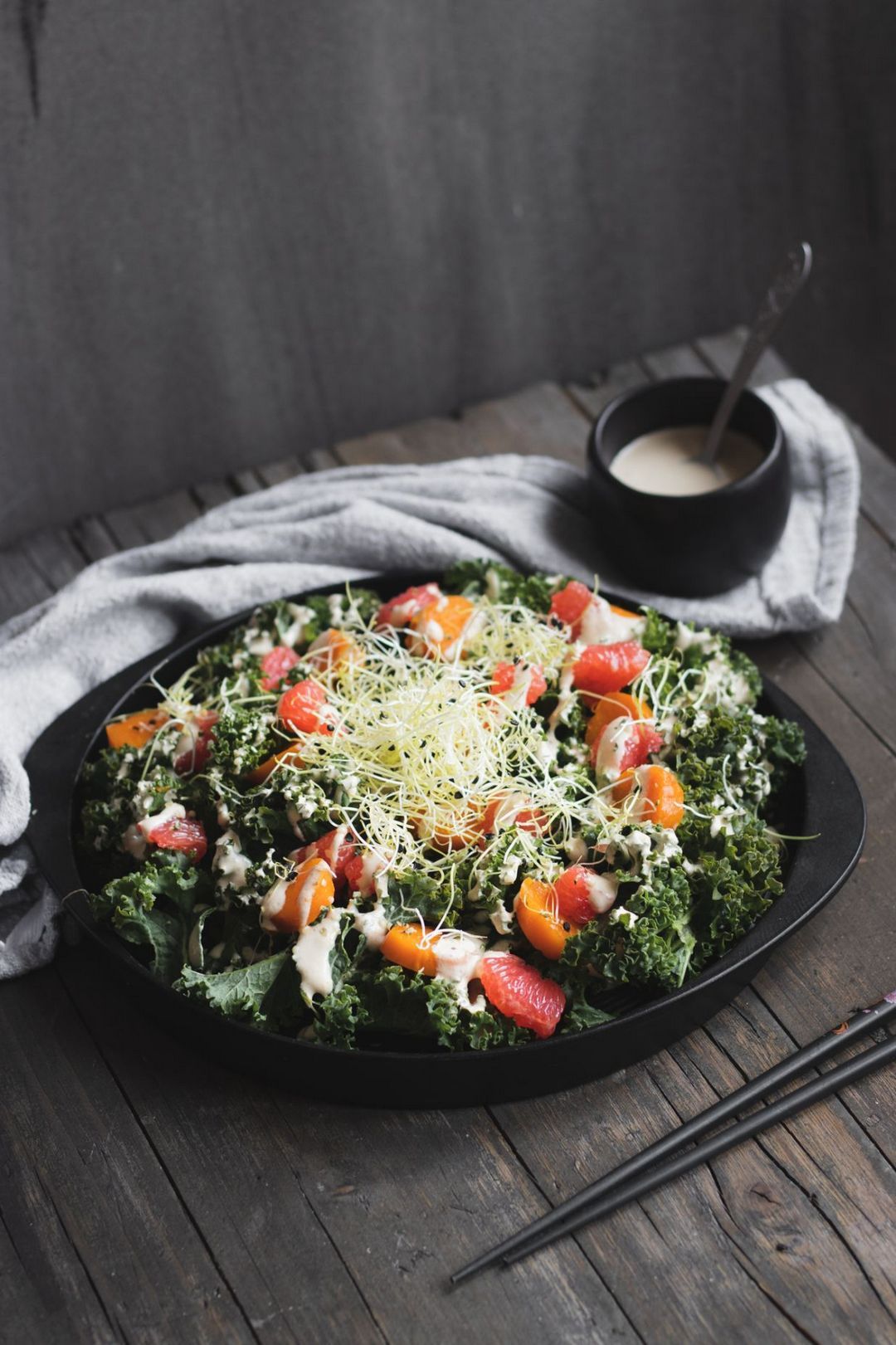 Ispecite batat u pećnici, ogulite ga i narežite. Kovrčavi kelj je odličan sirov, pa ga ja za salate ne kuham. Narežite kelj i grejp. Za umak pomiješajte tahini, sjemenke konoplje, đumbir, sol, papar, ocat, naribanu koru naranče i iscijeđeni sok naranče. Izblendajte u blenderu kako biste dobili potpuno glatku teksturu. Za nešto rjeđi dresing možete dodati i malo vode dok blendate.