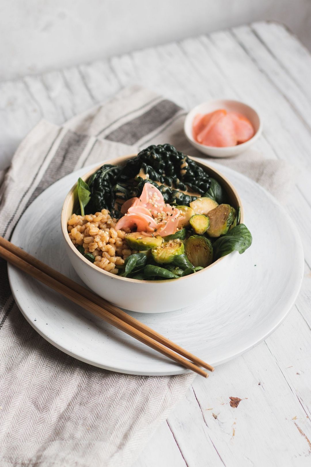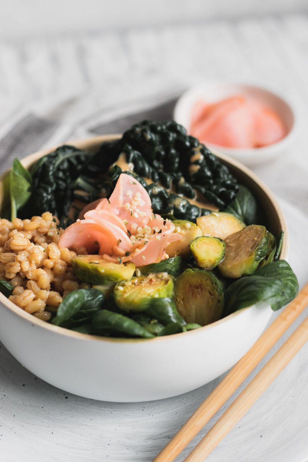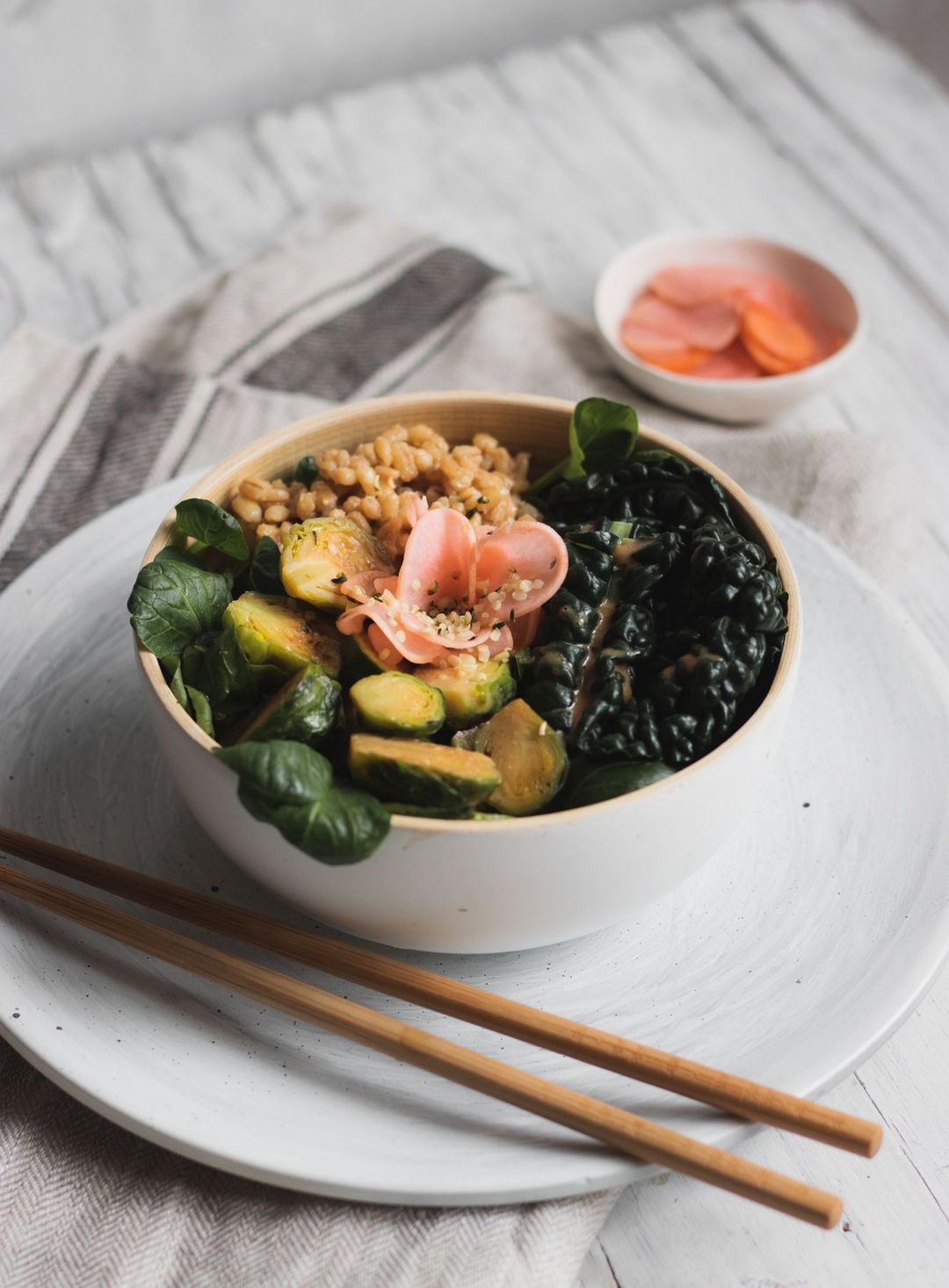 Za umak izblendajte miso, shoyu, maslac od kikirikija, naribanu koricu i sok limuna, ocat, datulje i dovoljno vode kako biste dobili potpuno glatku teksturu. Složite svježe lisnato povrće na dno zdjele, i na njega stavite ječam, prokulice i kelj. Prelijte umakom i servirajte.