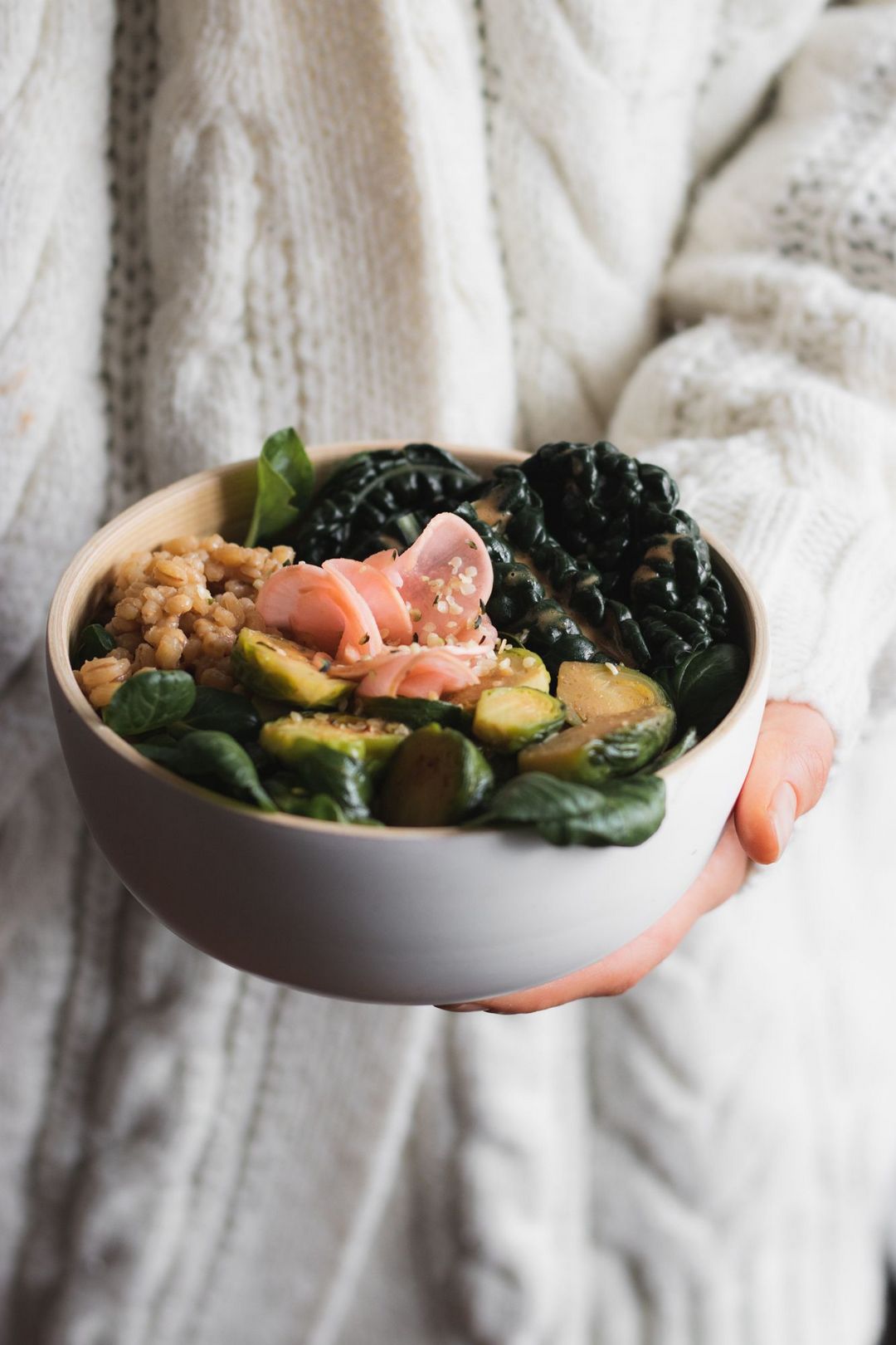 Skuhajte ječam u jednoj i pol šalici vode. Kratko skuhajte narezani kelj na pari ili u kipućoj vodi (meni je minuta kuhanja dovoljna, ali slobodno prilagodite ukusu). Prokulice prerežite po dužini na pola i kratko zapecite na tavi koju ste tanko premazali kokosovim uljem.