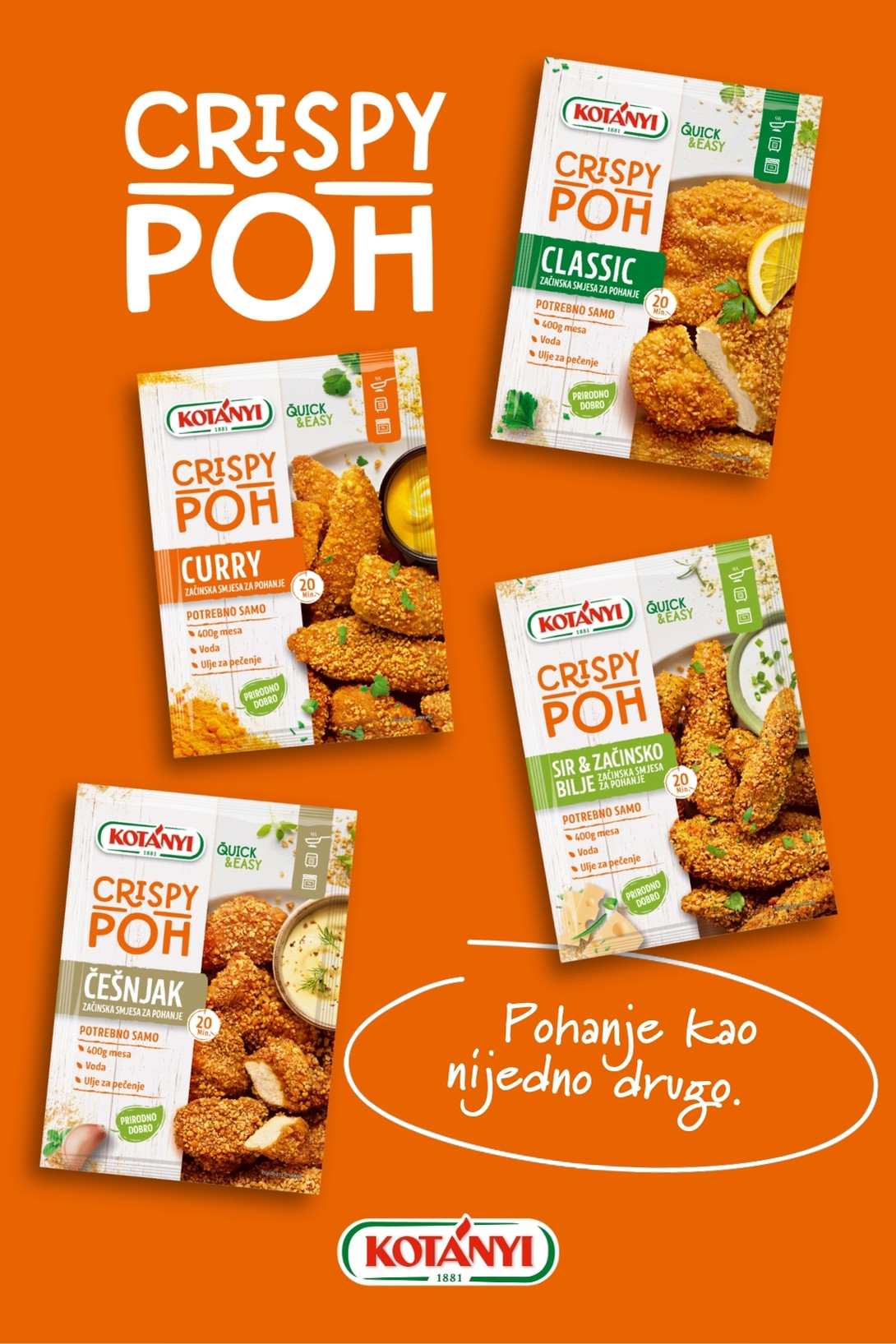 Od sada, zahvaljujući Kotanyi Crispy POH-u, super ukusni hrskavi pohanci ulaze u kategoriju jela „na brzaka“.  Za samo 20-ak minuta dobit ćete savršenstvo! I to: brže od dostave! Hrskavo i meko kao bakino, a zapravo vaše. Kotányi Crispy POH linija proizvoda pripremu ukusnih i hrskavih pohanaca čini jednostavnijom i čišćom. S lakoćom ga mogu svladati čak i početnici u kuhinji ili  školarci, što je važno svim roditeljima koji rade dok su im djeca doma na aktualnim praznicima.