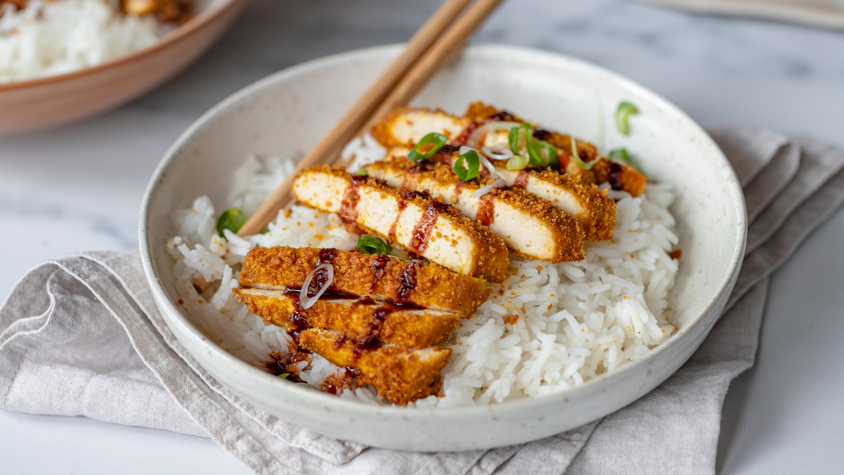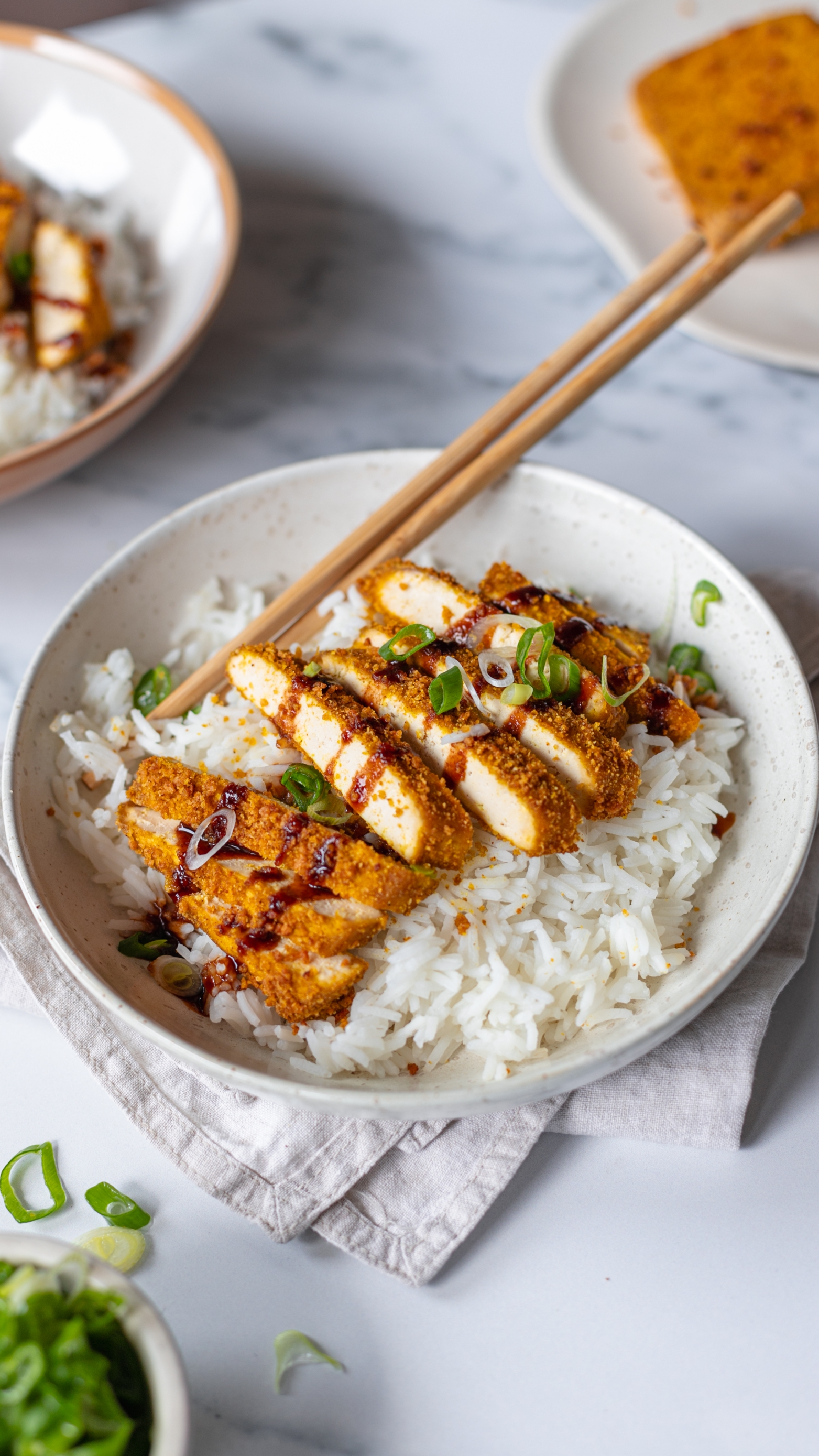 4. Poslužite hrskavi tofu uz kuhanu basmati rižu, umak po želji i mladi luk.