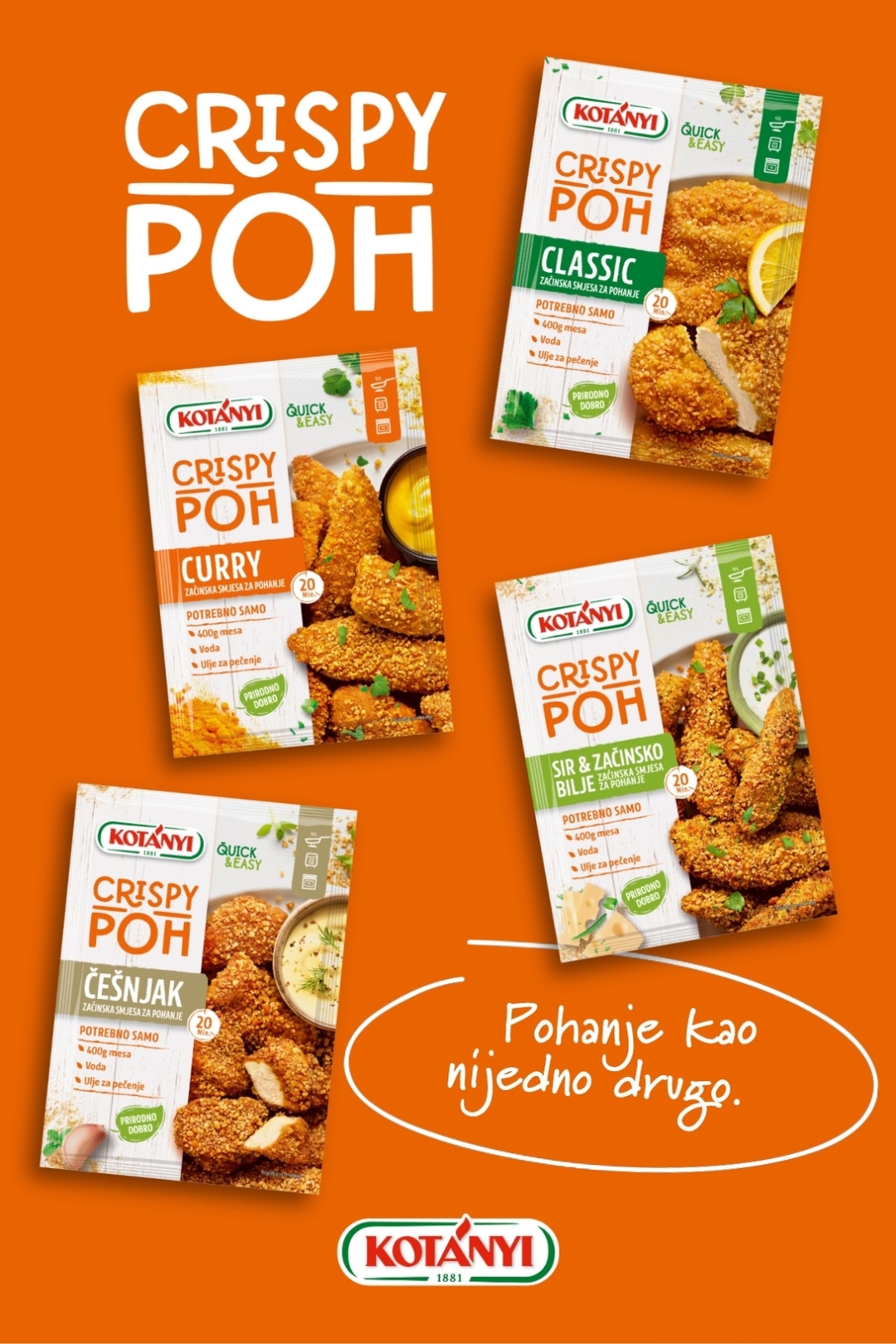 Od sada, zahvaljujući Kotanyi Crispy POH-u, super ukusni hrskavi pohanci ulaze u kategoriju jela „na brzaka“. Za samo 20-ak minuta dobit ćete savršenstvo! I to: brže od dostave! Hrskavo i meko kao bakino, a zapravo vaše. Kotányi Crispy POH linija proizvoda pripremu ukusnih i hrskavih pohanaca čini jednostavnijom i čišćom. S lakoćom ga mogu svladati čak i početnici u kuhinji ili školarci, što je važno svim roditeljima koji rade dok su im djeca doma na aktualnim praznicima.