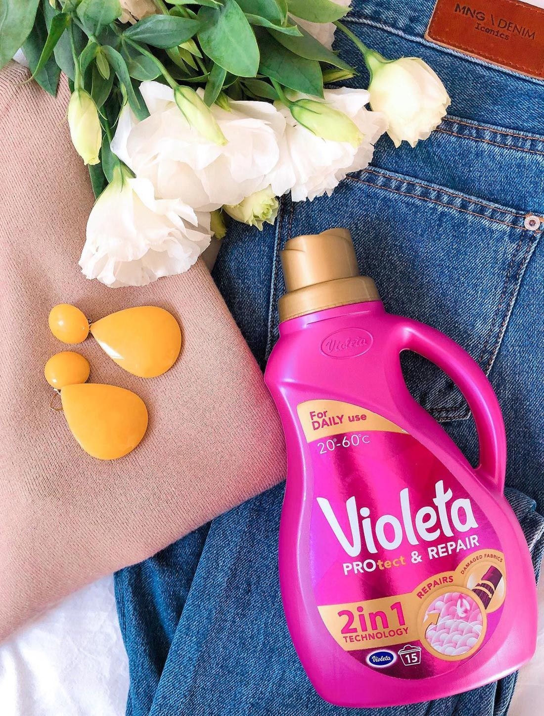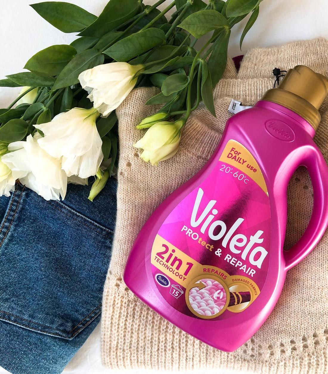 Violeta Protect & Repair deterdžent sadrži specijalno razvijenu formulaciju koja sadržava Repair Serum. Ovaj serum sadrži kombinaciju enzima čija je zadaća njegovati i obnoviti oštećena vlakna odjeće. Molekule enzima se vežu na oštećena celulozna vlakna odjeće zaglađujući ih.