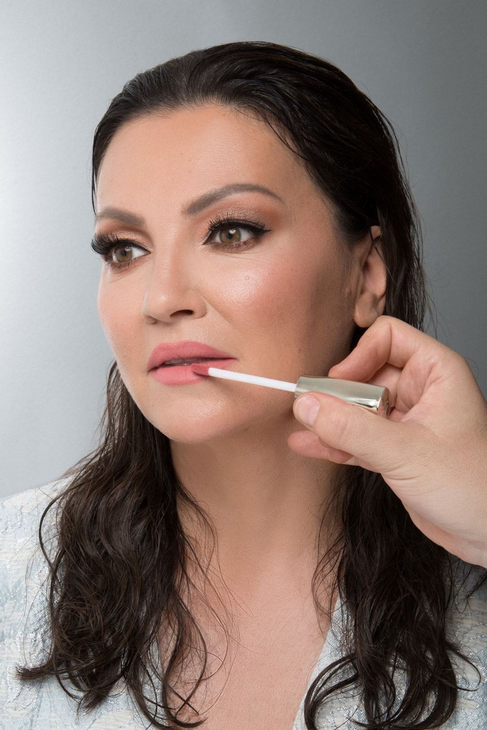 Za sjenčanje kapaka Saša i Nina su odabrali mat sjenilo u toplim nijansama smeđe i ružičaste iz palete Dolce Diva Eyeshadow Palette. Preko nje je nanesena mješavina metalik tonova za zavodljivi mono look. Oči je naglasio jednim od svojih make-up favorita – vodootpornom maskarom s dualnim aplikatorom Dolce Diva Twist Brush Waterproof Mascara.