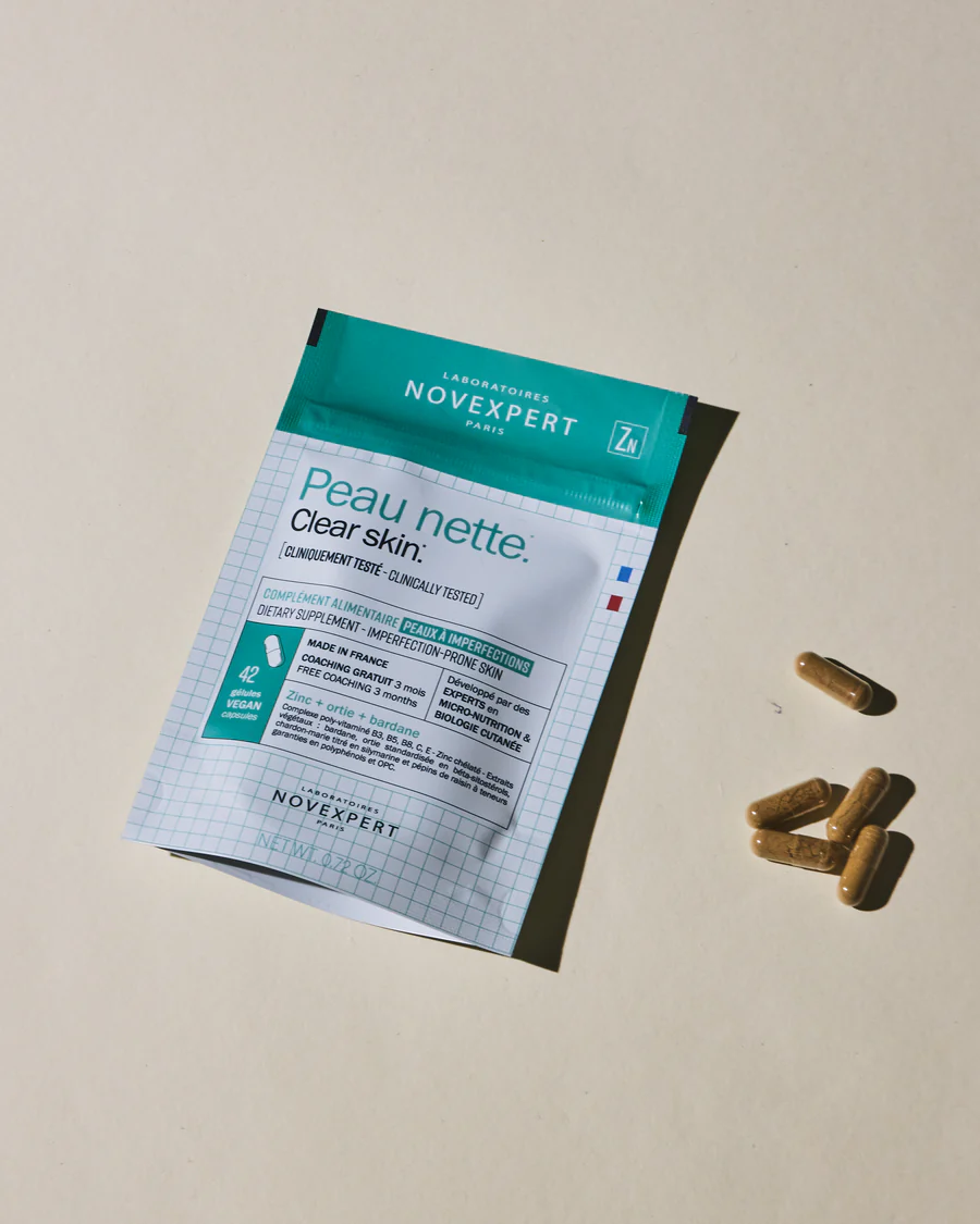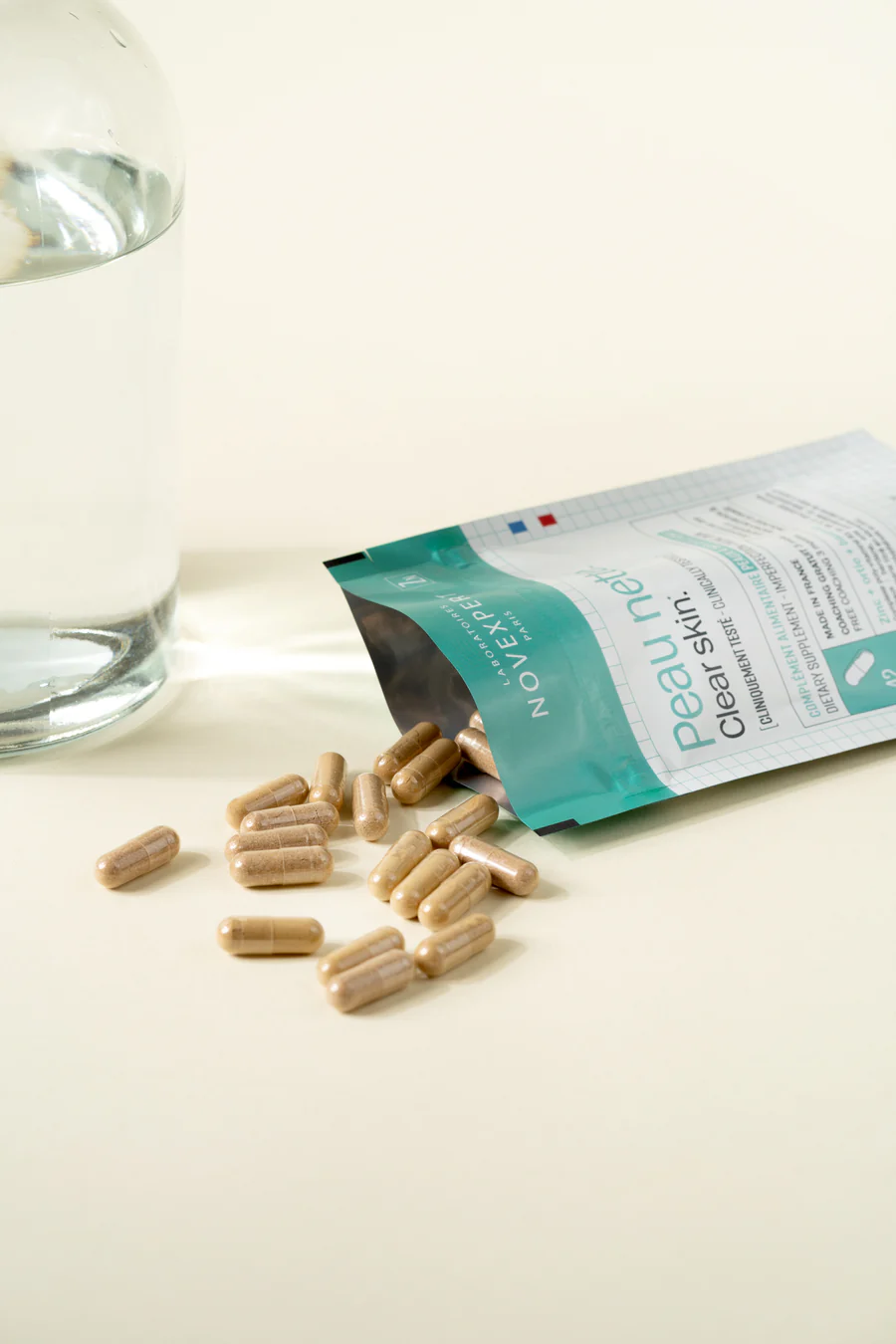 - Novexpert Clear Skin kapsule sadrže biljne ekstrakte (kopriva, čičak, grožđe – OPC), cink i vitamine C, E i B skupine. Djeluju na kožu pogođenu hormonalnim promjenama (PMS, stres, PCOS), podržavaju rad jetre i smanjuju upalne procese