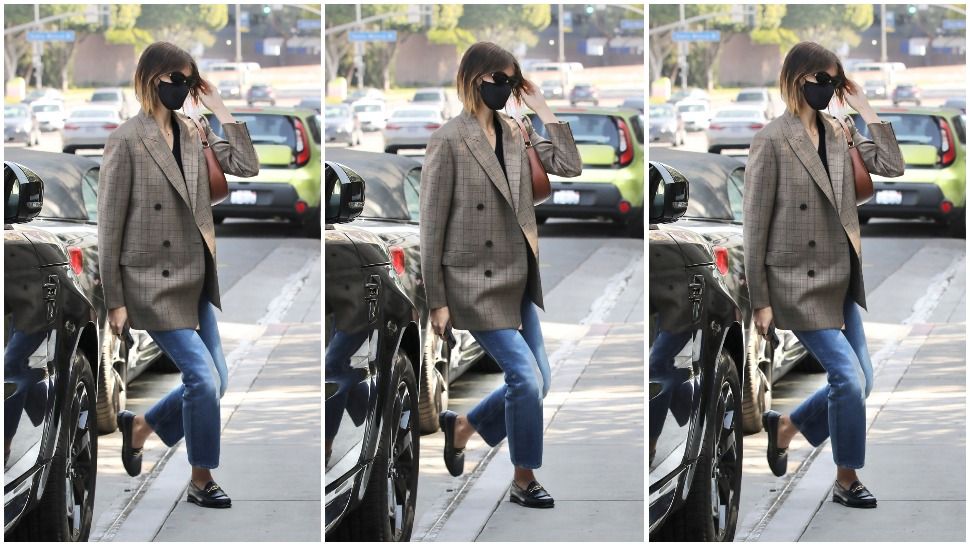 Crni top i traperice ravnog kroja, dužine 7/8 koja otkriva gležnjeve, Kaia nosi u kombinaciji s crnim sunčanim naočalama i trendi torbom u smeđoj boji te jednostavnim crnim loafericama. Kako bi ovoj ležernoj i cool kombinaciji dala sređeni izgled i dozu moderne elegancije, Kaia je preko nje prebacila karirani blejzer oversized kroja.